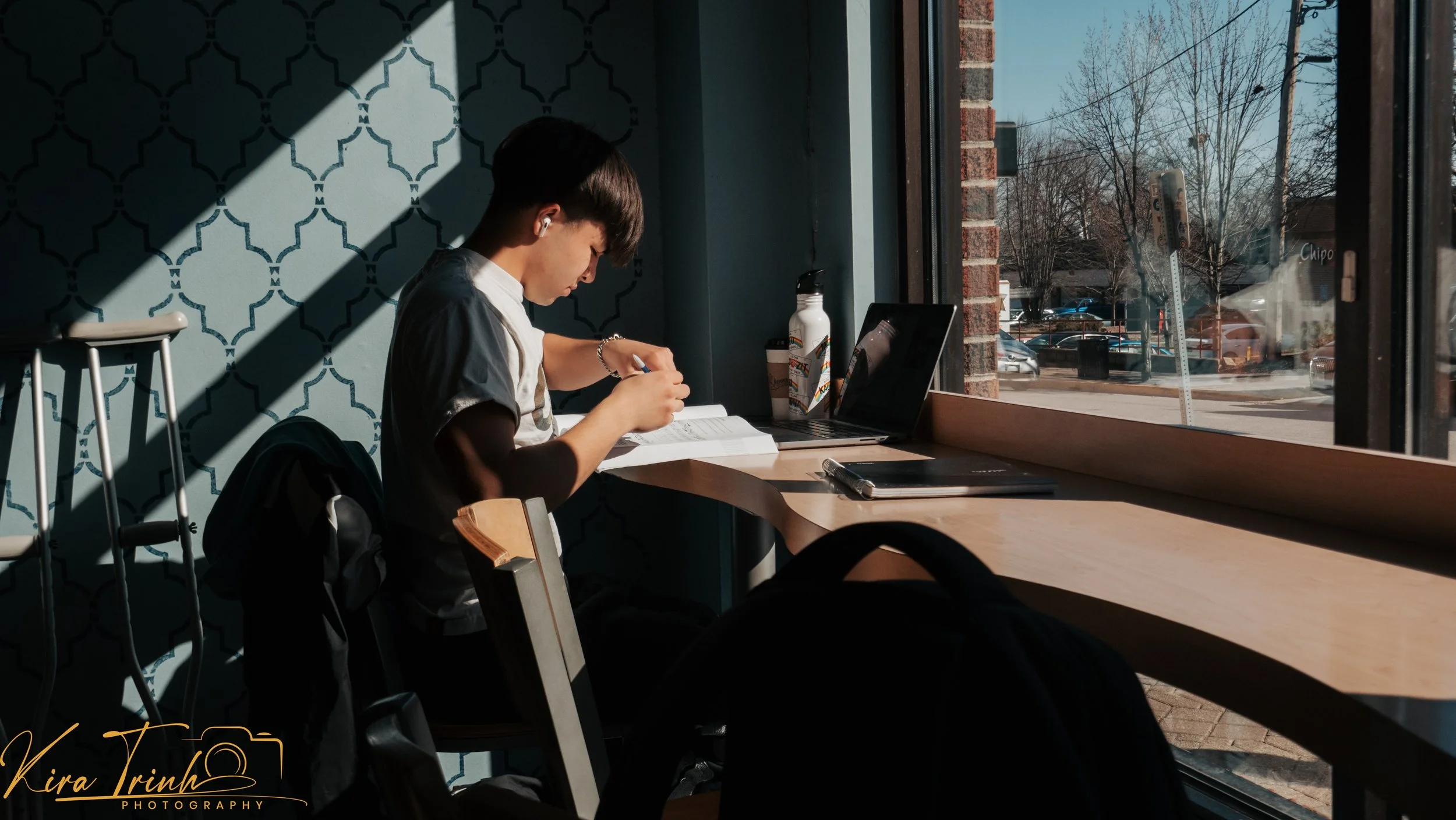 A student sitting at the table window in Vienna Coffee Shop in WL, IN