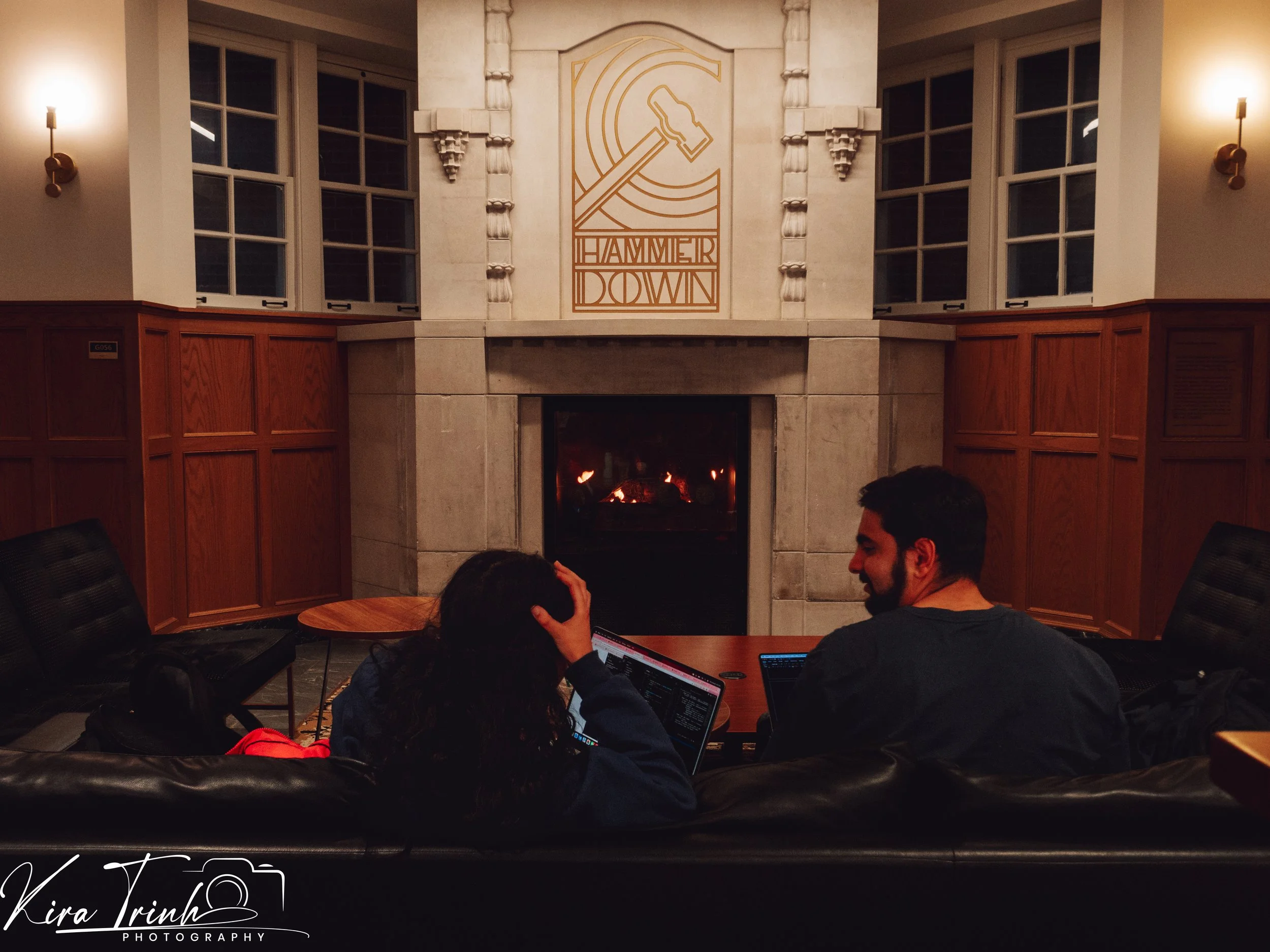 Two students sitting in front of a fireplace in the basement of Purdue Memorial Union